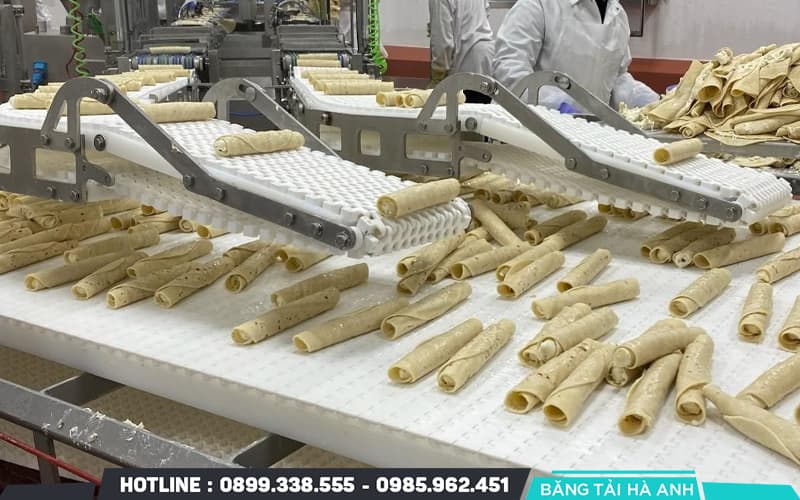 - Ngành thực phẩm – đồ uống: Băng tải nhựa xuất hiện phổ biến trong dây chuyền chế biến, đóng gói thực phẩm, nước giải khát. Chất liệu an toàn, dễ vệ sinh và không nhiễm tạp chất giúp đảm bảo vệ sinh an toàn thực phẩm.