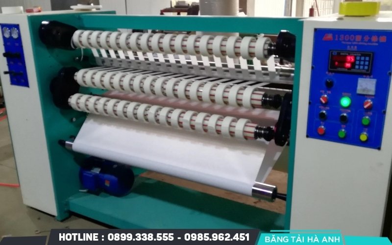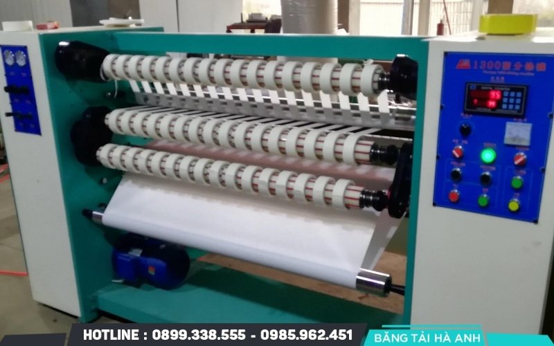 Cuộn màng lớn sau khi sấy khô và cuộn lại gọi là cuộn Jumbo. Cuộn Jumbo được đưa lên Máy Phân Cuộn (Slitter) để cắt thành các cuộn Log có kích thước chiều rộng tiêu chuẩn. Quá trình này sử dụng lưỡi cắt siêu sắc bén và hệ thống căng màng chính xác, đảm bảo mép cuộn Log phẳng và không bị tưa rách. Sau đó, cuộn Log sẽ được đưa qua Máy Cắt (Log Slitter) để cắt thành các cuộn băng dính thành phẩm cuối cùng với chiều dài theo yêu cầu.