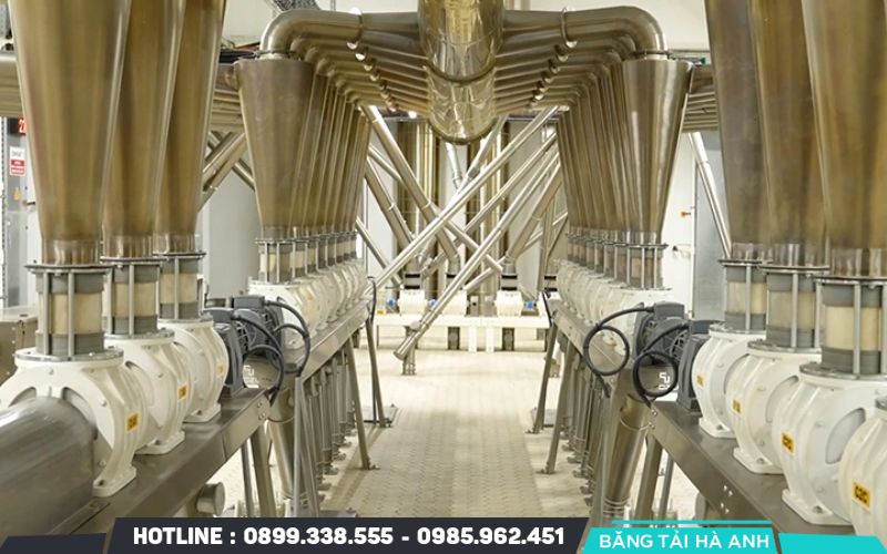 Băng tải đóng vai trò trung tâm trong việc duy trì hiệu suất và chất lượng của toàn bộ dây chuyền sản xuất bột mì.