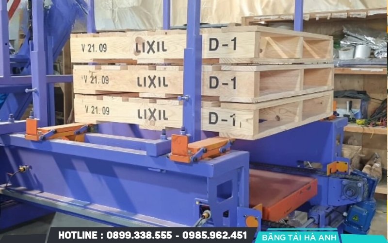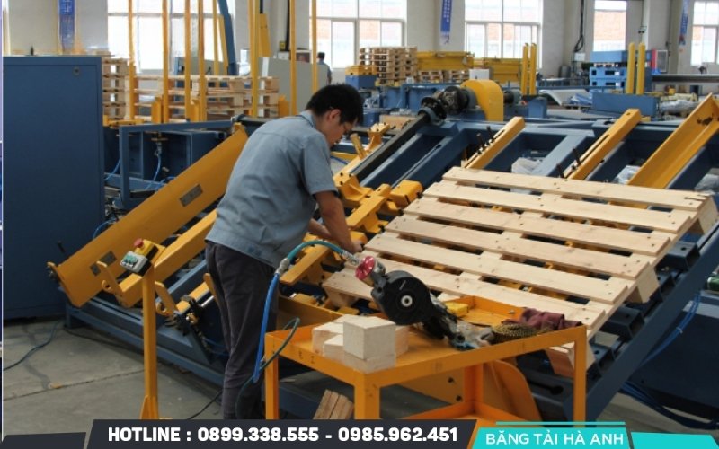 Trong dây chuyền sản xuất pallet gỗ, băng tải đóng vai trò trung tâm trong việc kết nối các công đoạn. Thông thường, doanh nghiệp sử dụng băng tải con lăn hoặc băng tải xích để vận chuyển gỗ, bán thành phẩm và pallet hoàn thiện. Băng tải con lăn thích hợp cho việc di chuyển các khối gỗ nặng, giúp thao tác trơn tru và tiết kiệm nhân lực. Băng tải xích mang lại sự ổn định khi vận chuyển pallet có tải trọng lớn và cần di chuyển liên tục.