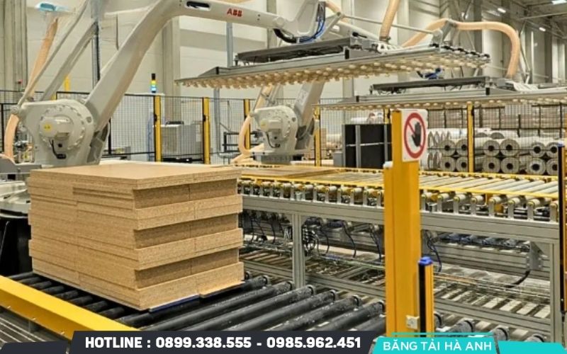Nhờ hệ thống băng tải, quy trình sản xuất diễn ra liên tục, giảm thời gian chờ, tăng năng suất và đảm bảo tính đồng bộ. Bên cạnh băng tải, robot bốc xếp giúp tự động hóa khâu nâng hạ và xếp dỡ pallet, còn máy sấy có chức năng giảm độ ẩm, chống cong vênh, đảm bảo pallet gỗ đạt chuẩn ISPM 15 trước khi xuất xưởng.