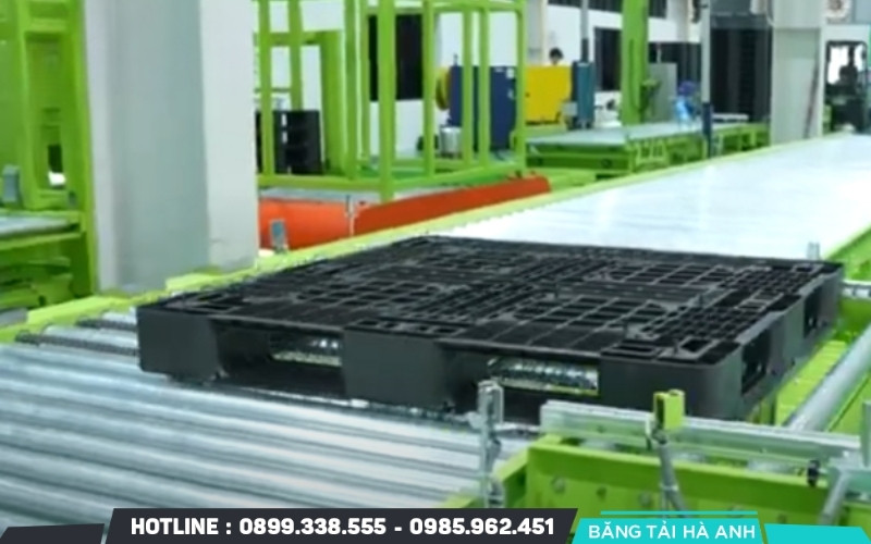 Băng tải đóng vai trò kết nối các công đoạn, vận chuyển nguyên liệu hoặc pallet bán thành phẩm một cách liên tục. Loại băng tải thường dùng trong dây chuyền pallet nhựa là băng tải con lăn hoặc băng tải xích, có khả năng chịu tải trọng lớn. Việc sử dụng băng tải không chỉ tăng hiệu suất mà còn giảm rủi ro gián đoạn dòng sản xuất.