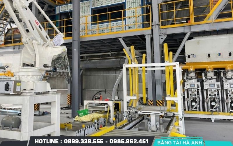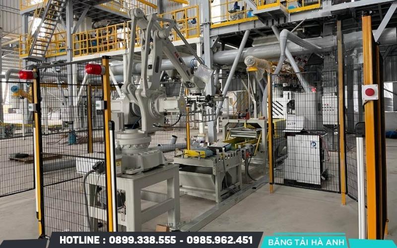 Robot bốc xếp tự động hỗ trợ sắp xếp bao vữa lên pallet gọn gàng, giúp giảm nhân công, tăng năng suất và tối ưu không gian lưu kho. Việc tích hợp tự động hóa ở khâu cuối cùng giúp dây chuyền vận hành trơn tru và nâng cao hiệu quả toàn bộ hệ thống.